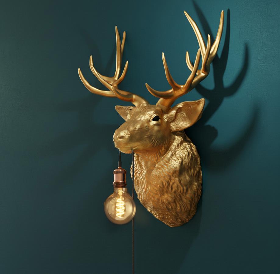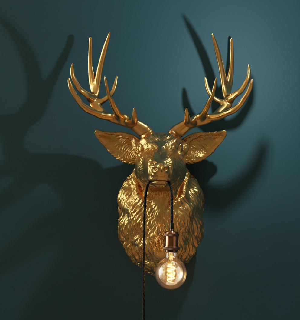 A sophisticated lighting object for special spaces: The golden deer head resembles a modern sculpture and, with its discreet bulb, transforms into a stylish wall lamp with warm, atmospheric light. Each piece is elaborately hand-painted and possesses a unique character.