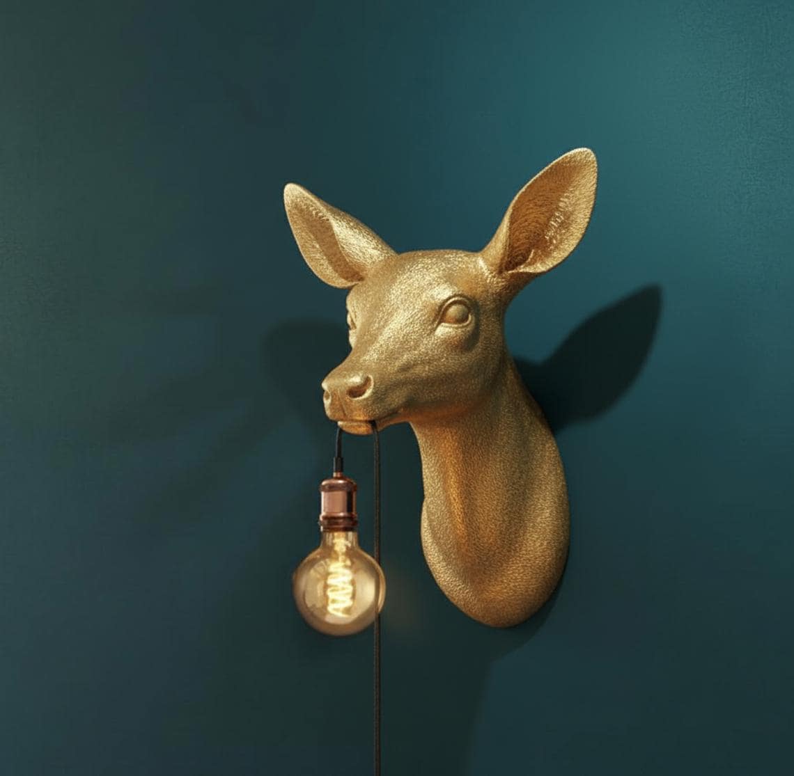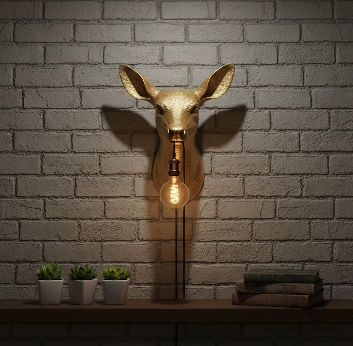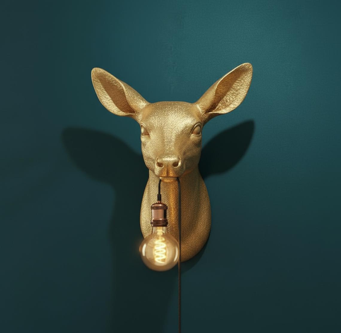 This extraordinary wall lamp combines elegance, design, and craftsmanship in one stylish piece. The golden deer head is elaborately hand-painted and varnished, giving it a soft sheen and a refined, finely textured surface.