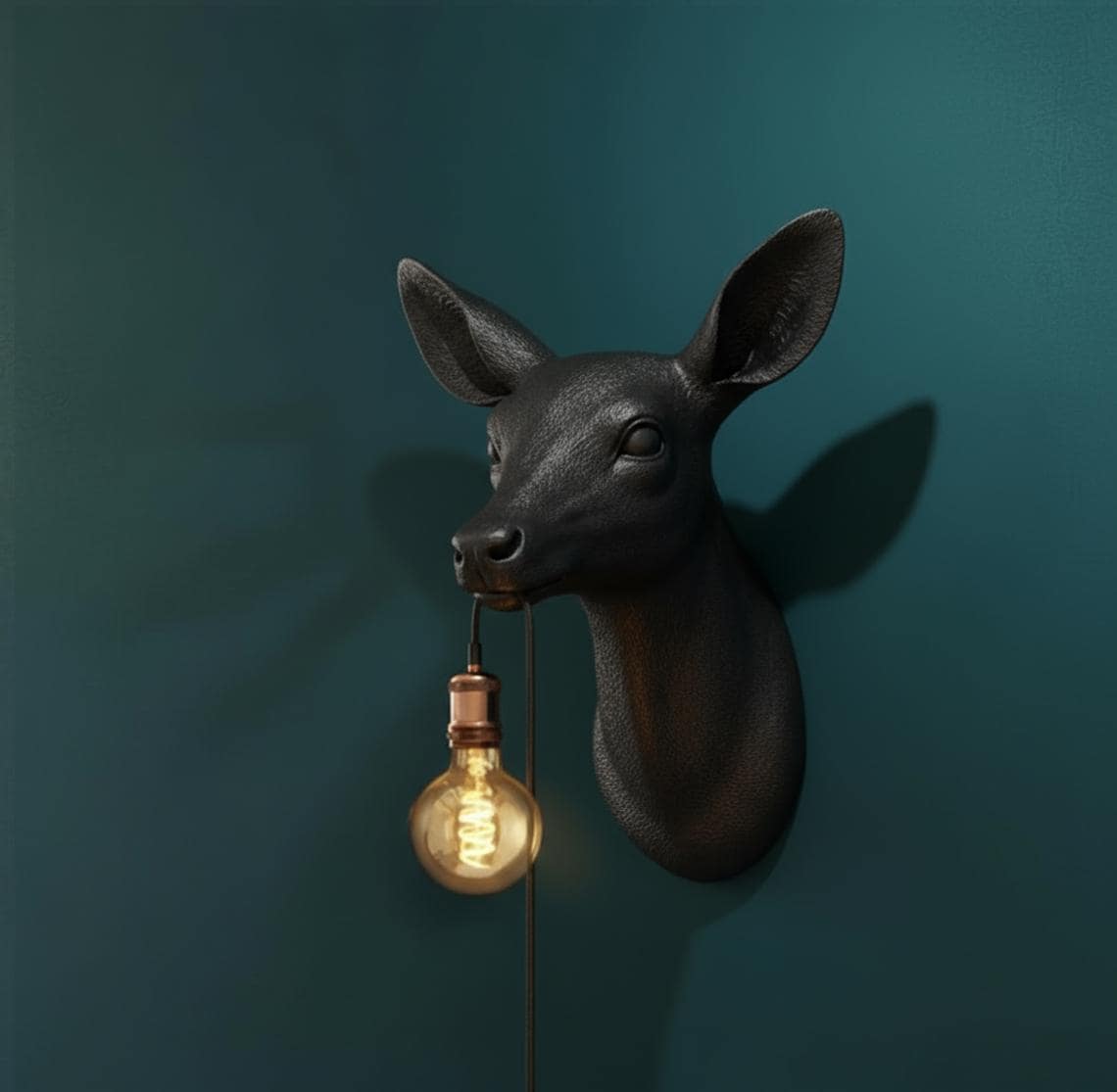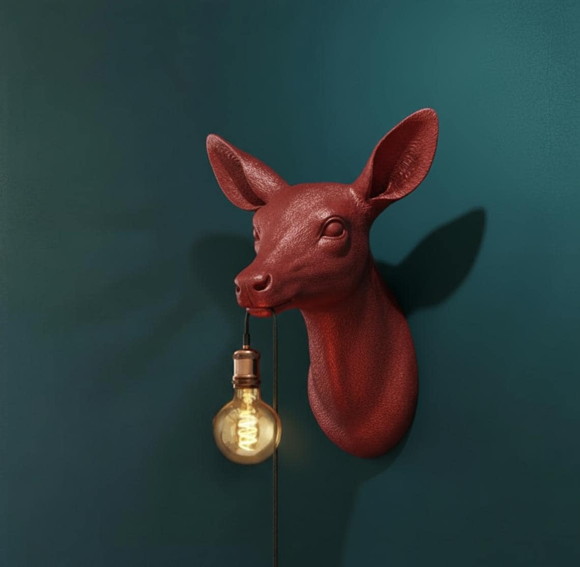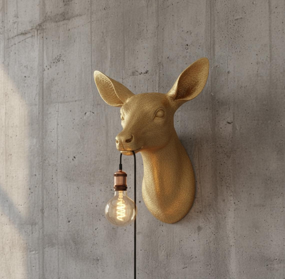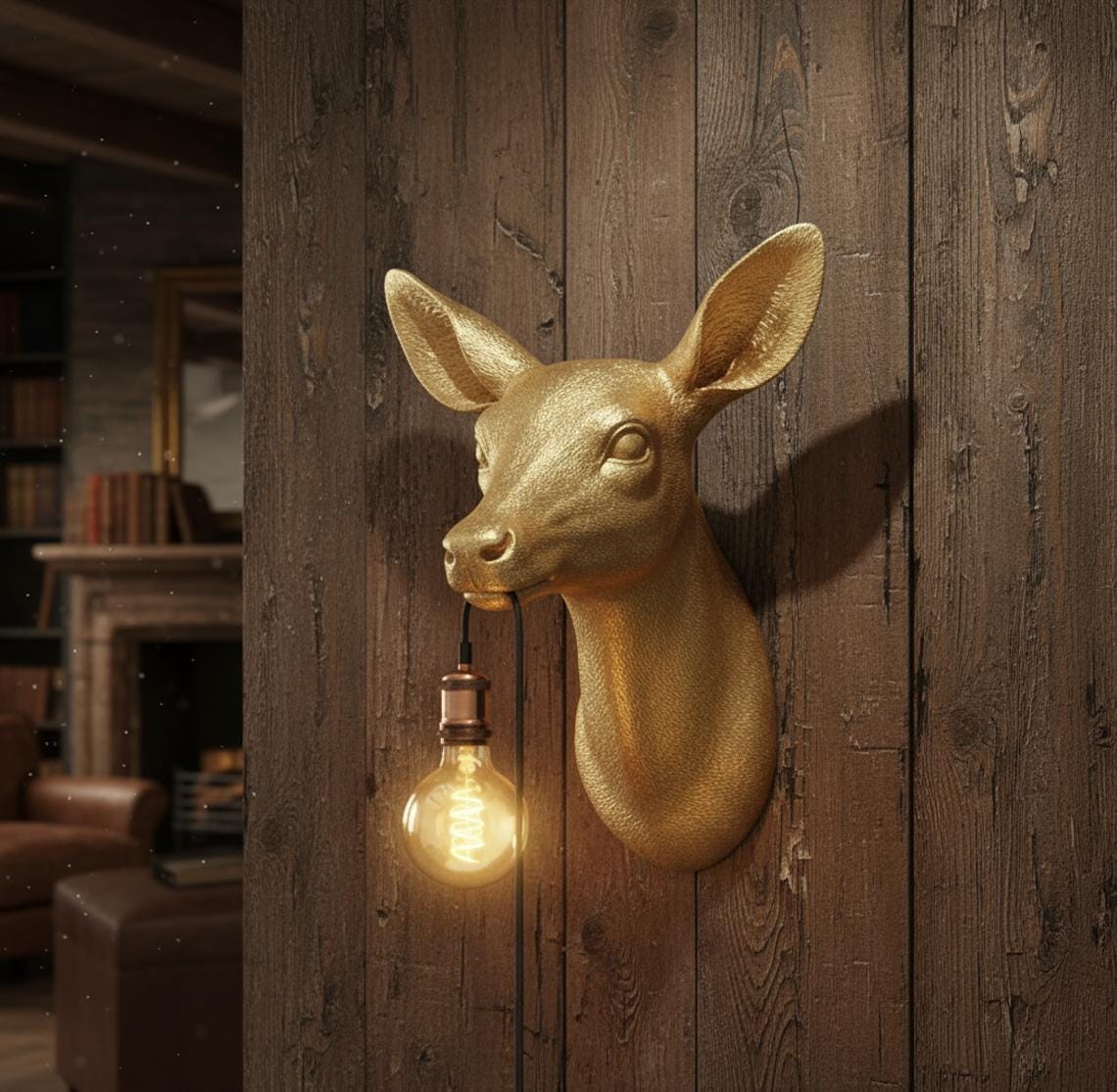 This extraordinary wall lamp combines elegance, design, and craftsmanship in one stylish piece. The golden deer head is elaborately hand-painted and varnished, giving it a soft sheen and a refined, finely textured surface.